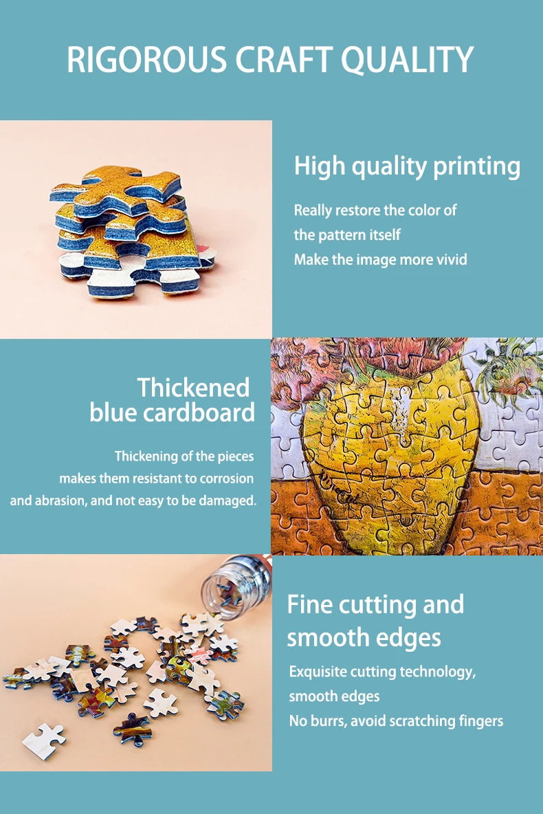 Plongez dans l'univers artistique avec ce splendide puzzle représentant 12 tournesols dans le célèbre vase de Van Gogh. Réalisé avec une excellente qualité de fabrication, chaque pièce s'assemble avec précision pour recréer cette masterpiece intemporelle. En reconstituant cette œuvre, vous exercez votre esprit de manière ludique : concentration, mémoire visuelle et résolution de problèmes se développent naturellement. Un véritable allié pour renforcer vos capacités cognitives tout en savourant le plaisir de créer quelque chose de magnifique.
